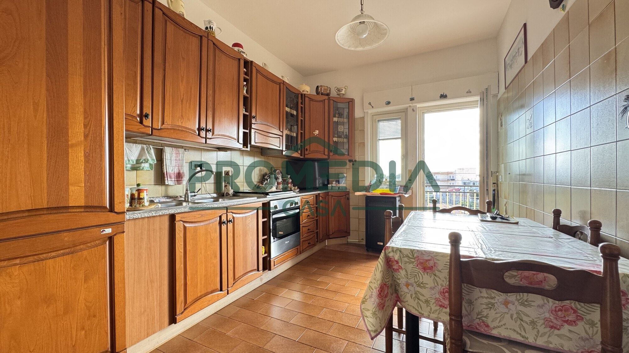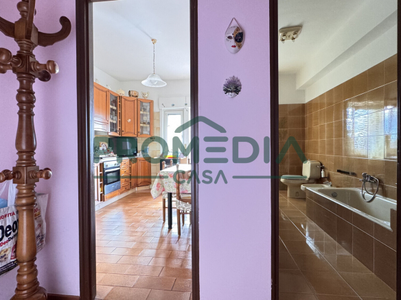 A seguire il corridoio conduce alla cucina abitabile con adiacente ripostiglio, ideale da utilizzare anche come vano dispensa/lavanderia e al comodo e luminoso soggiorno. Entrambi gli ambienti hanno uscita tramite porta-finestra sul primo balcone.