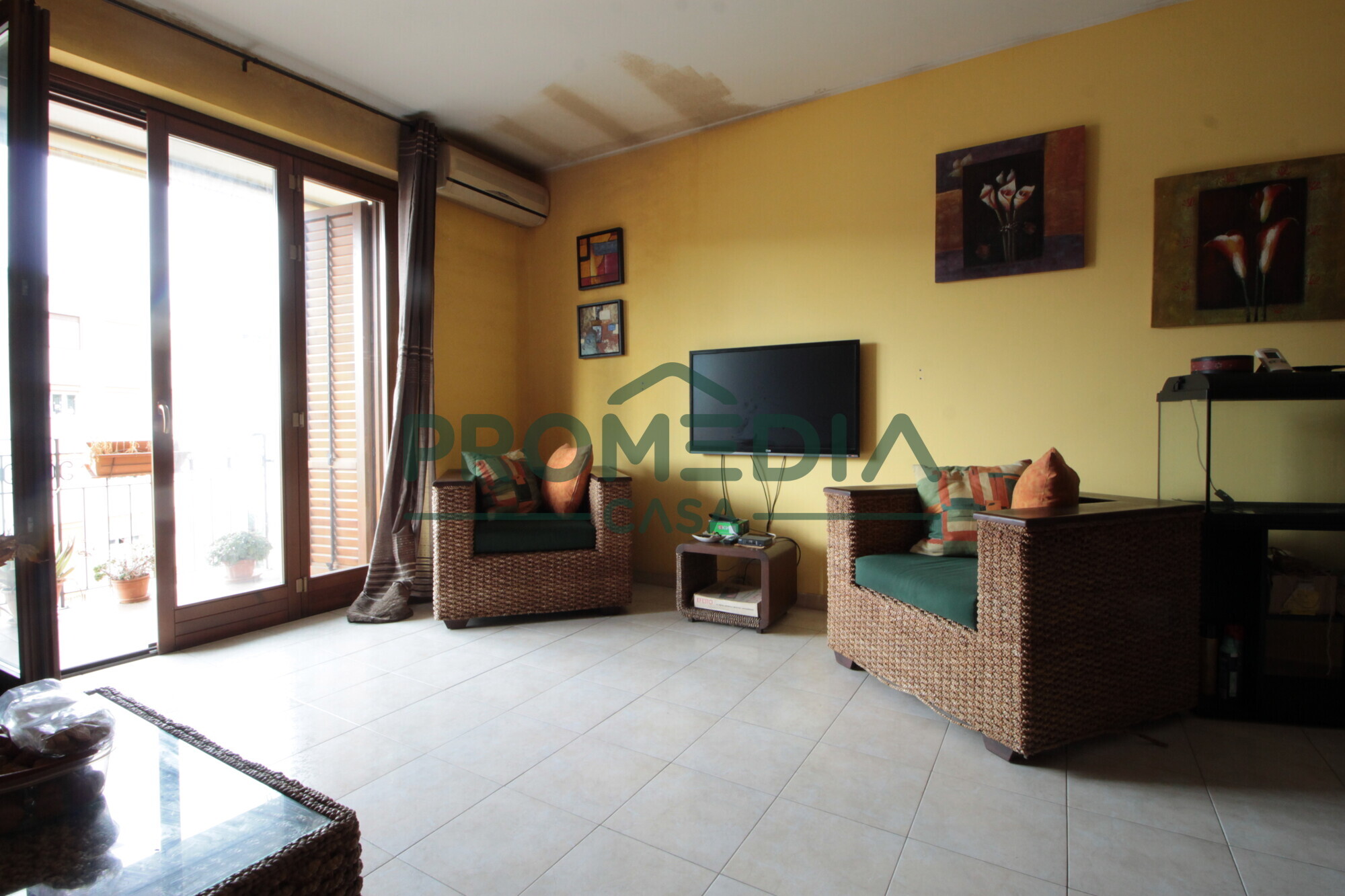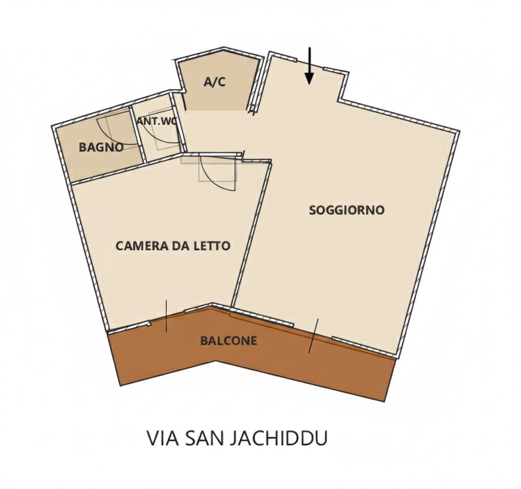L’ingresso dell’abitazione è sul soggiorno di 24mq che affaccia sull’unico balcone del bilocale che affaccia sulla Via San Jachiddu. Comunicante è l’angolo cottura senza finestra.
