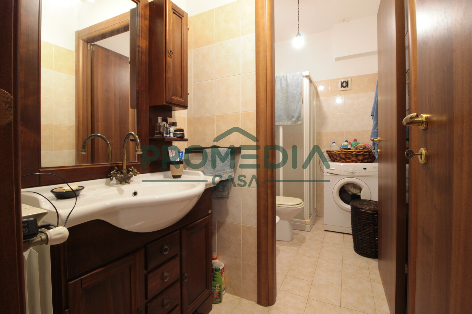 Il bagno con antibagno è dotato di areazione forzata e box doccia.
