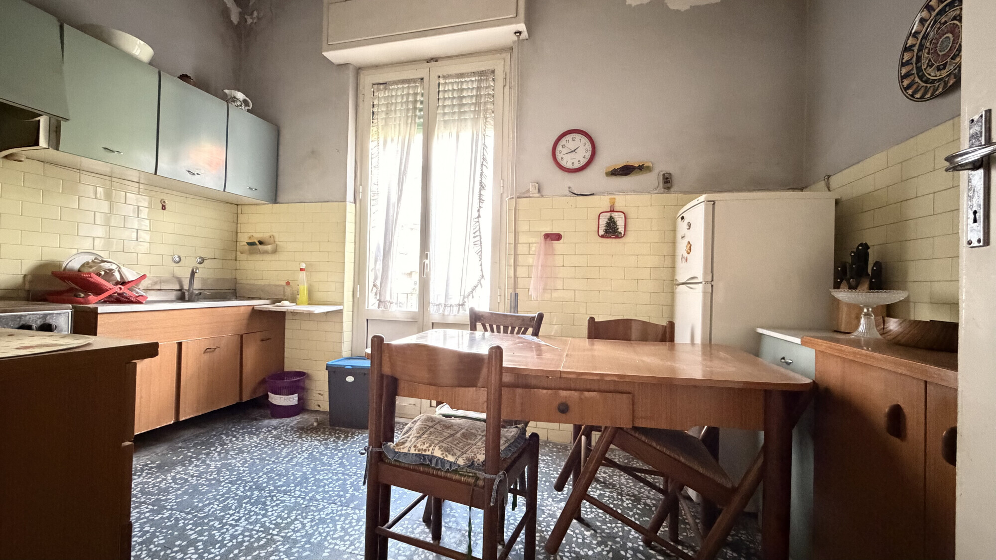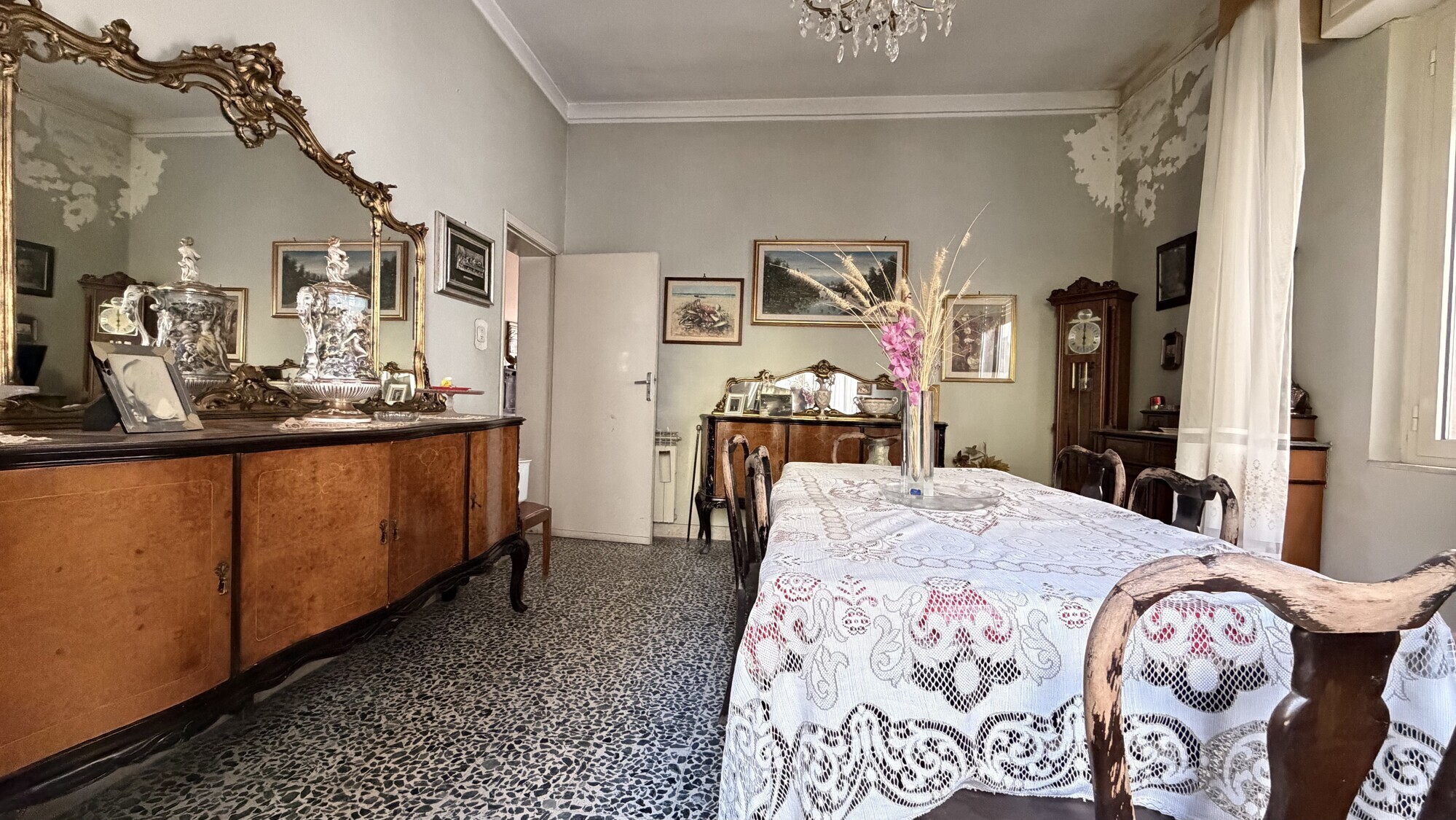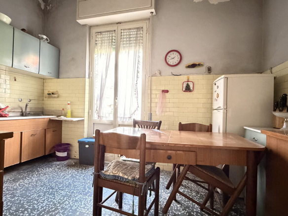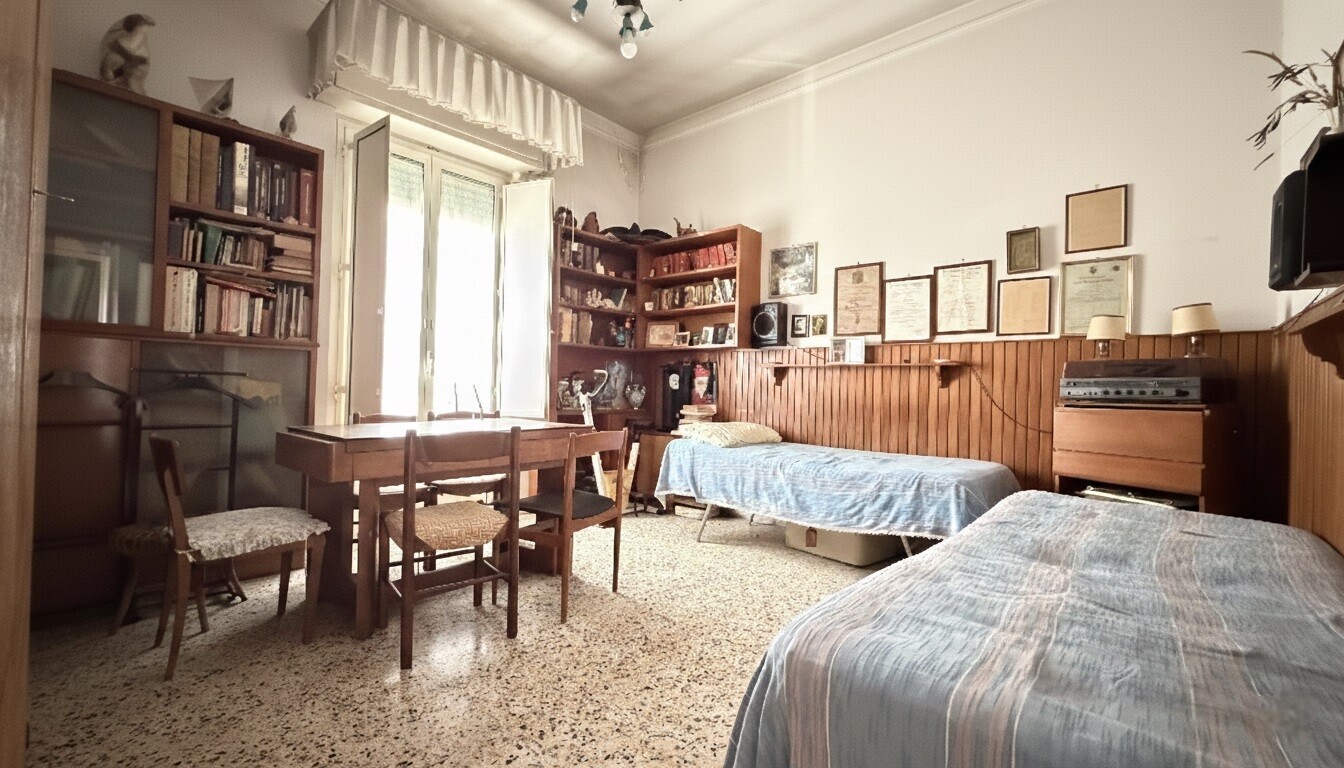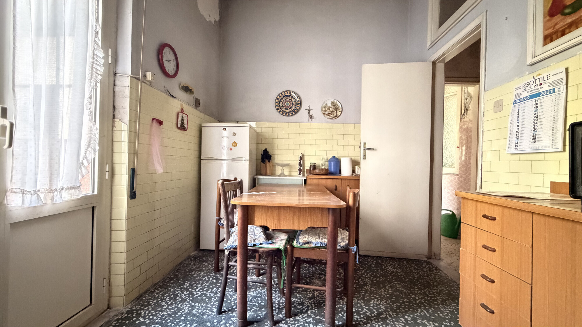 L’ingresso spazioso conduce a un salone molto ampio e luminoso, caratterizzato da doppie finestre angolari. La metratura permette diverse modifiche, come la creazione di un moderno open-space unificando il salone alla camera adiacente. La cucina è abitabile e servita da un utile spazio esterno.